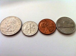 The penny says “ONE CENT,” the nickel says “FIVE CENTS,” the dime says “ONE DIME,” and the quarter says “QUARTER DOLLAR.”